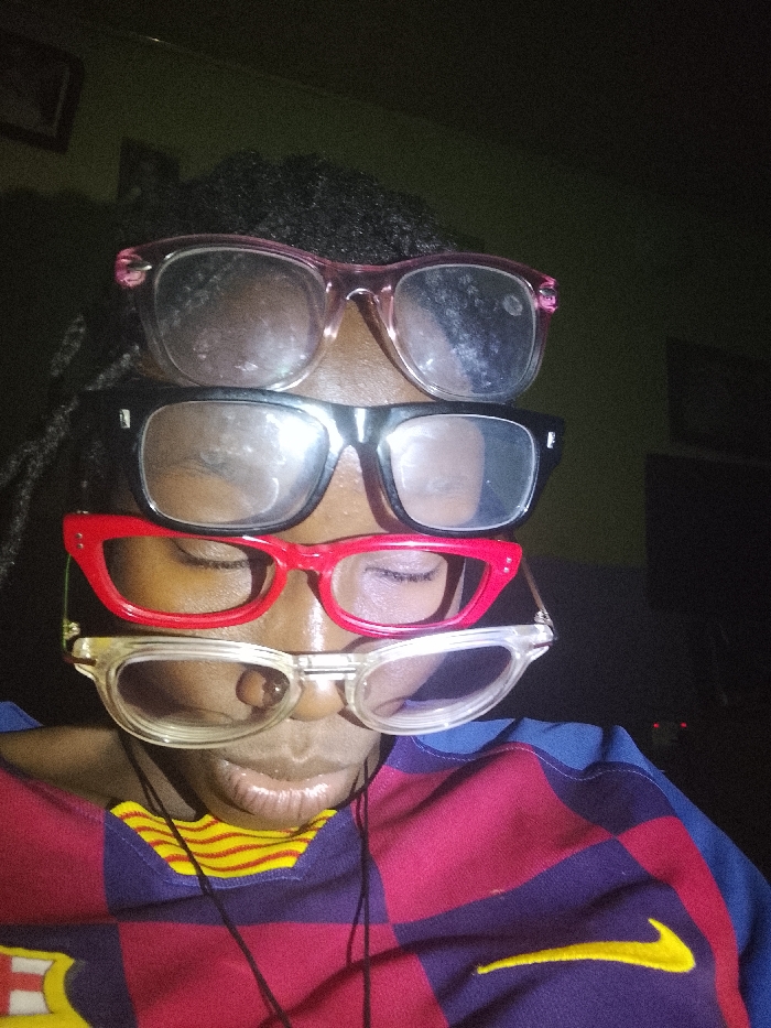 A person stacks four pairs of eyeglasses on their face: pink at the top, followed by black, red, and clear. The person wears a dark blue and red shirt with a yellow Nike swoosh logo. Braided hair peeks from the top of their head, and earbud wires hang down. The room appears dimly lit, with darker hues in the background.