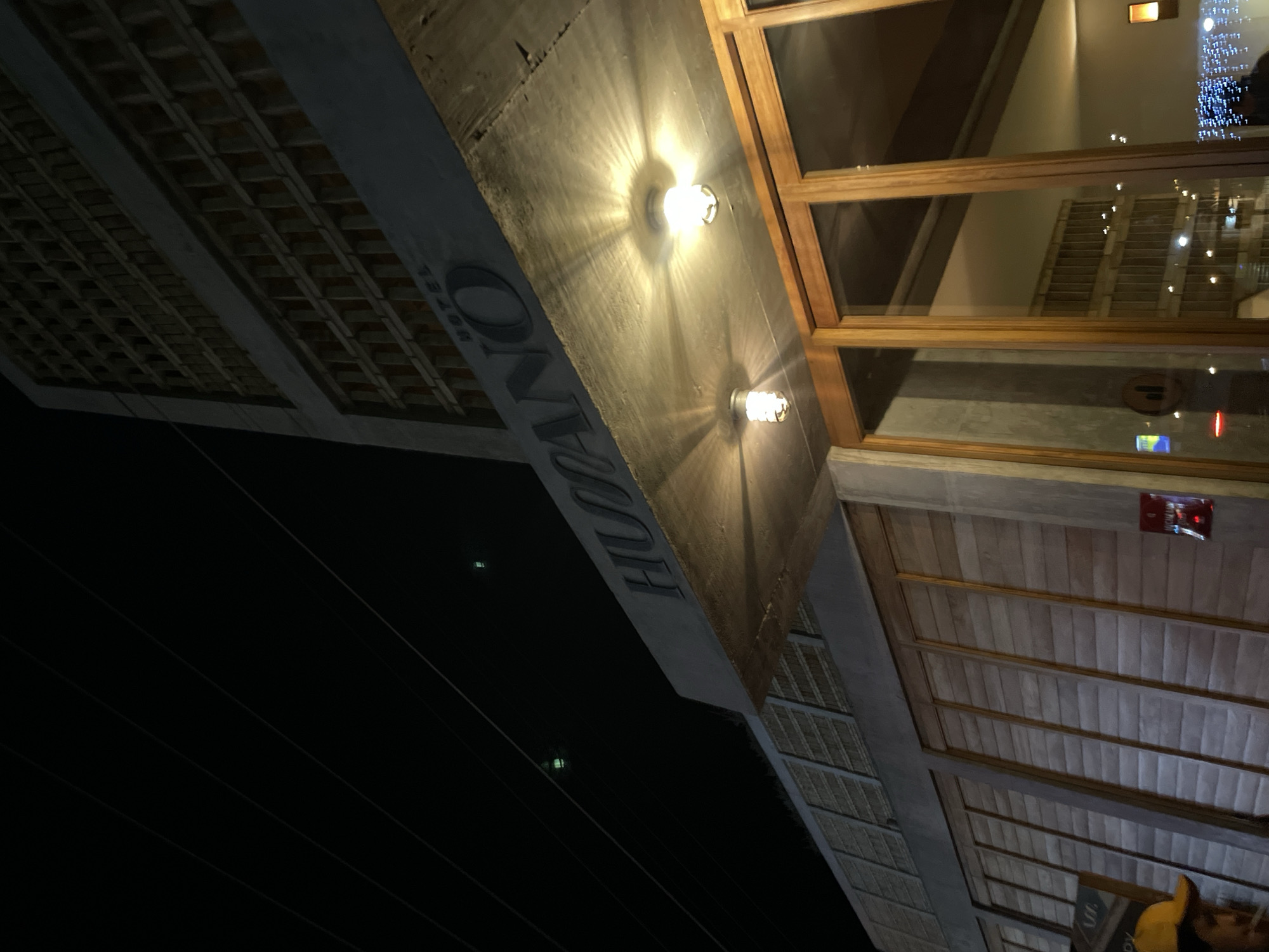 The exterior of a building with large windows is seen at night in Brisas de Zicatela, Mexico. The building's signage reads "HUATANO". Two lights illuminate the exterior wall. One or more people are visible within the building through the windows.