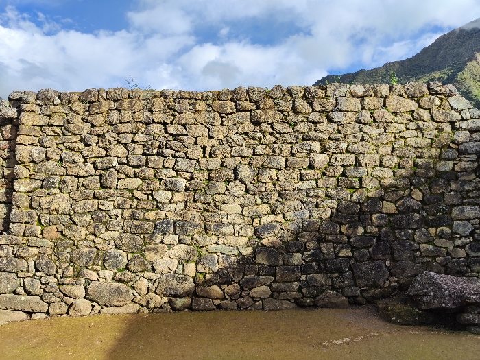 A weathered stone wall dominates the scene, constructed from irregular, earth-toned rocks. Patches of moss and shadow add depth and texture. A mountain ridge rises in the background under a partly cloudy sky. The ground in front of the wall is an earthen hue, completing the ancient, naturalistic composition.