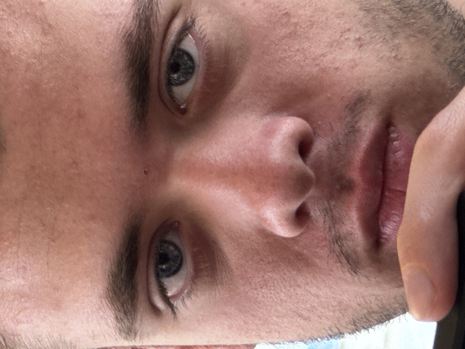A close-up, front-facing photographic portrait of an adult male is depicted, located in the city of Sliven, Bulgaria. The subject's face occupies the majority of the frame, exhibiting a light skin tone with visible pores and minor cutaneous irregularities on the forehead and cheeks. The irises are blue-grey, with pupils centrally dilated, and the gaze is directed forward. Dark eyebrows are present above each eye. A small epidermal blemish is visible on the forehead, centrally positioned between the eyebrows. The nose is central, with both nostrils visible. The subject's mouth is slightly open, revealing the lower lip and a segment of the upper lip. Fine, dark stubble is evident across the chin and jawline area. The distal phalanx of a digit, consistent with a thumb, is visible at the lower edge of the frame, positioned beneath the subject's mouth and appearing to support a dark, indeterminate object. The background is uniformly bright and out of focus, providing no specific environmental details beyond its luminance.