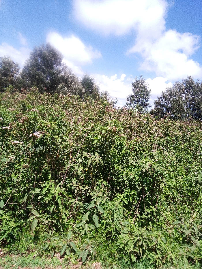 The image captures an outdoor natural landscape in Nachu ward, Kenya, under a bright blue sky with scattered white cumulus clouds. The scene is dominated by dense, verdant vegetation. The foreground and midground consist of a thick expanse of various green shrubs and herbaceous plants, displaying both small white flowers and clusters of reddish-brown flower or seed heads. Several yellow spherical fruits or berries are also visible amidst the foliage. A narrow strip of green grass and soil is present at the immediate base of the vegetation. In the background, a line of tall, dark green trees forms a dense treeline against the sky. No individuals, animals, or artificial structures are present within the frame.