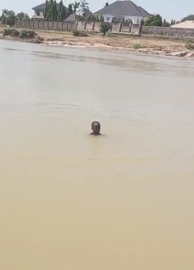 person in a river. The person, seemingly a child, is standing in the water, which is murky and light brown. Ripples spread out from the person in the water. The person then submerges completely before resurfacing. Buildings and vegetation line the opposite bank of the river. The sky is overcast.