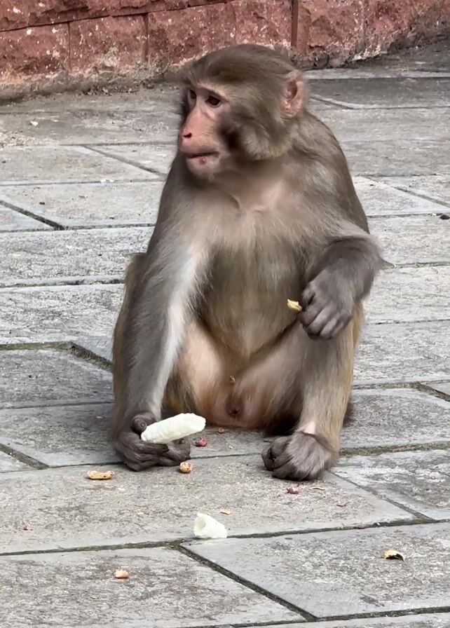 - "A monkey sits on a gray brick surface against a brick wall, eating something and holding a banana" by FM-7eaFY2, licensed under CC BY 4.0