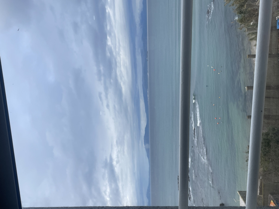 This image depicts a coastal view in Ksar es-Seghir, Morocco, observed from an elevated position, likely a balcony or window, framed by a vertical grey pillar on the left and two horizontal white railings in the foreground