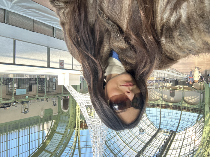 A female subject is depicted in a close-up, head-and-shoulders selfie taken inside the Grand Palais in Paris, France. She has long, dark brown hair, wears large, brown-tinted wraparound sunglasses, a cream-colored turtleneck, and a mottled brown fur coat. Her head is angled slightly to the right, and a faint smile is present. The background reveals the distinctive interior architecture of the Grand Palais, featuring its high, arched glass roof and green-painted steel framework. A prominent white, latticed replica of the Eiffel Tower stands in the mid-ground to the right of the subject. The floor is a smooth, light-colored surface, possibly an ice rink, enclosed by a low barrier system consisting of metal handrails and a white lower section. Several indistinct individuals are visible walking in the far left background. A reflective disco ball hangs from the high ceiling structure. The scene is illuminated by natural light filtering through the expansive glass roof.