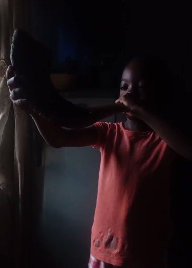 A young child, dressed in a bright coral-colored t-shirt and plaid shorts, is seen holding a large, dark-colored horn-like object to their mouth and blowing into it. The environment is dimly lit, creating a stark contrast with the child's clothing. A window with a thin, light-colored curtain is visible to the left, while a muted television screen and a white refrigerator-like structure are visible behind the child, enhancing the contrast between light and shadow. The child’s arms are raised, holding the horn steady as they blow into it, seemingly focused on producing a sound.