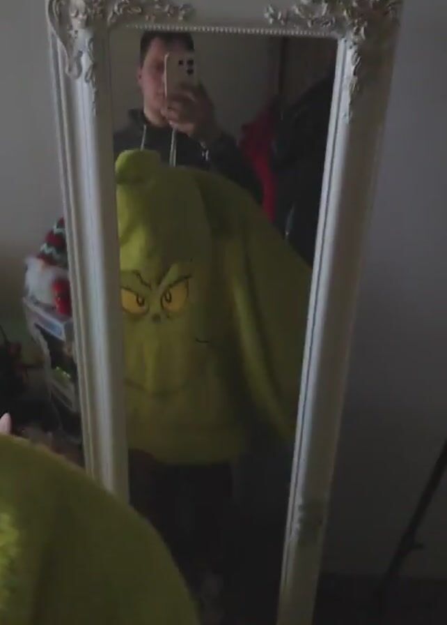 A person holds a fuzzy, lime green garment in front of a mirror. The mirror reflects the person holding a phone, and a garment depicting the Grinch. The environment is dimly lit.