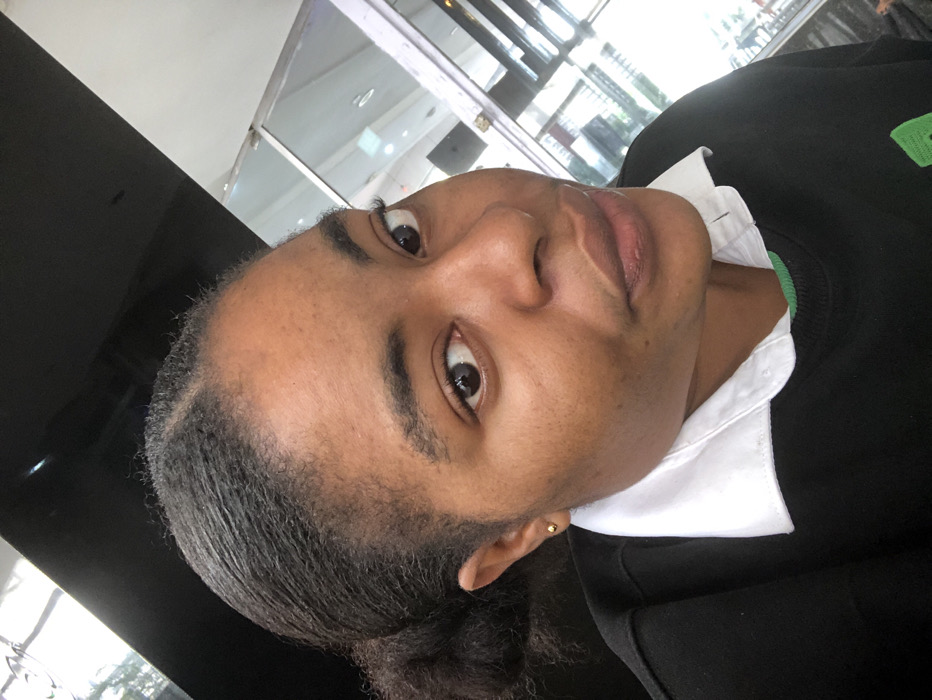 A close-up portrait depicts a female subject, appearing to be of African descent, located in the city of Ilado, Nigeria. She looks directly at the camera with a neutral expression. Her dark hair is pulled back from her face, slicked down, and styled with a visible part on the left side, culminating in a bun or ponytail at the rear. She wears a small gold stud earring in her visible left earlobe. Attire consists of a white collared shirt beneath a black long-sleeved crew-neck sweatshirt that displays a partial green design on the front. The background is out of focus, featuring a dark, reflective surface dominating the upper left, transitioning to an area on the right that shows reflections from what appear to be interior glass panels or windows, suggesting an indoor commercial or office setting with artificial lighting.