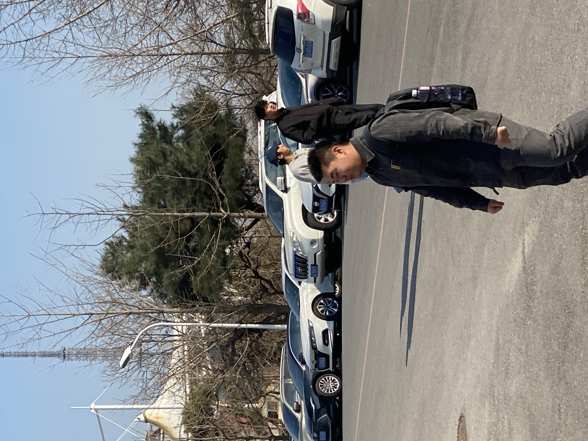The image depicts a street scene in Zhongtun, China. Several cars are parked in a row, mostly white SUVs, with visible license plates. Two individuals are present: one wearing a dark jacket, facing toward the right, and another wearing a black jacket and light gray shirt. The pavement is gray, and bare trees and evergreen trees are in the background. A tower structure is barely visible in the distance.