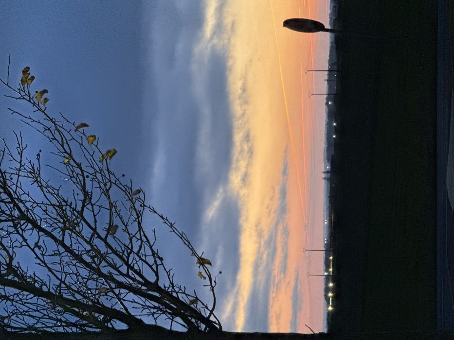 A twilight scene features a stark, bare tree in the foreground, its branches reaching towards a sky divided between blue and a gradient of orange, pink, and peach hues. The right side of the frame shows a dark field dotted with lights, possibly streetlamps or distant buildings, and power lines silhouetted against the colorful sky. The transition from day to night is captured with a balance of natural elements and man-made structures.