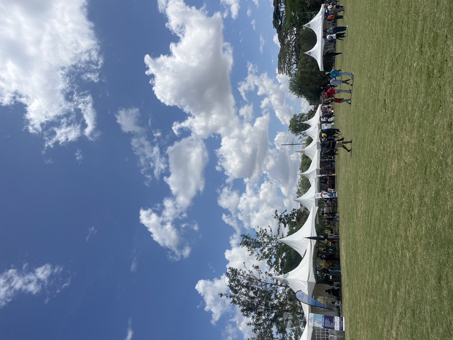 A blue sky filled with fluffy white clouds dominates the image. Along the right side, a line of white tents with pointed tops stretches across a green grassy field. People stand under and near the tents, suggesting a gathering or event. Some trees punctuate the line of tents, offering shade. The scene conveys an outdoor atmosphere under a bright sky.