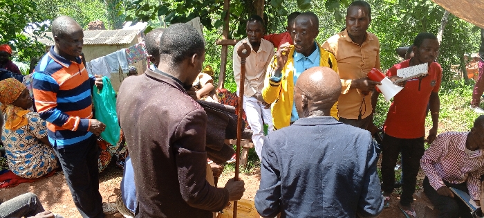 A group of men gather, some standing and some seated in an outdoor setting. One man holds a walking stick, while another holds a white and red megaphone. People are dressed in a variety of casual and formal clothing, including button-down shirts, T-shirts, and blazers. Some women are present in the background. A clothesline with laundry hangs near a small building. The overall impression is that of a community meeting or gathering.