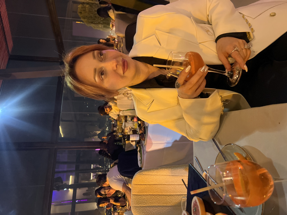 A female individual is seated at a table in an upscale restaurant located in Yerevan, Armenia. The scene is illuminated by interior lighting against a dark night sky that reveals a panoramic view of the city lights. The female, positioned in the foreground, wears a white blazer over a black garment. She holds a stemmed glass containing an orange-colored beverage, a straw, and an orange peel garnish. Rings are visible on her left hand (large dark ring) and right hand (multiple silver-toned rings); her fingernails are painted a light, metallic shade. On the table to her lower left, an identical cocktail glass with a straw and garnish is present, along with two halves of a pink grapefruit. The table surface is light-colored. In the midground, numerous other patrons are visible seated at multiple white-clothed tables, engaged in dining and socializing, with various dishes, bottles, and glasses present. The background features large floor-to-ceiling windows overlooking the illuminated urban landscape of Yerevan. A slatted or trellis-like structure is visible above the windows.