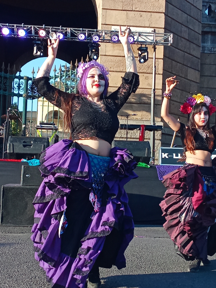 The image displays two females performing outdoors on an elevated stage in Recoleta, Chile. The primary subject, positioned in the foreground on the left, is a woman with purple hair and "sugar skull" facial makeup featuring white skin, black eye circles, and red lips. She wears a black lace crop top, exposing her midriff, a teal sequined hip scarf, and a large, multi-tiered purple ruffled skirt with black lace trim over black pants. A purple floral crown adorns her head, and tattoos are visible on both forearms. Her arms are raised above her head, palms facing forward. To her right, a second woman, partially visible, also exhibits "sugar skull" makeup and wears a black crop top with a dark red ruffled skirt. She has a multi-colored floral crown and her right arm is raised. Both subjects wear dark shoes. The performance stage is dark, featuring multiple large speakers, a metal truss structure equipped with LED stage lights, and a dark banner or backdrop with "K-LI" partially legible in white text. In the background, a large, light-colored stone building with a prominent arched entrance and ornate metal gates is visible. The scene is illuminated by natural daylight, casting shadows on the ground.