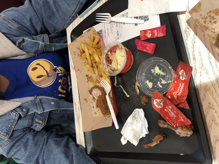 A fast food meal tray sits beside a person wearing a denim jacket and a blue shirt with a yellow smiley face. The tray holds remnants of a meal: french fries in a carton, a small container of coleslaw, a partly eaten piece of fried chicken, discarded ketchup packets, salt packets, chicken bones, a used napkin, and a plastic fork. A receipt is also visible.