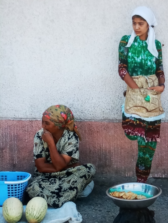An outdoor scene in the city of Pakhtakor, Uzbekistan, depicts two females against a two-toned wall. The upper section of the wall is a pale, textured surface, while the lower section is a reddish-brown, textured surface. The ground is a dark, granular surface. On the left, a middle-aged female is crouched on the ground. She wears a multi-colored floral headscarf and a short-sleeved, dark-patterned dress. Her right hand is raised near her mouth. To her left is a blue plastic woven basket. In front of her, resting on a white cloth, are two light green, oval-shaped melons with faint stripes. On the right, a younger female stands, leaning against the wall. She wears a white headscarf, a long-sleeved green patterned tunic, multi-colored patterned leggings, and a light brown apron with a pocket, in which her left hand is placed. She is looking slightly to her left. On the ground in front of her, a silver-colored metal bowl sits on an indistinct dark object, containing several light-colored, possibly baked or fried flatbreads and a folded blue fabric item. No direct interaction between the two individuals is depicted.
