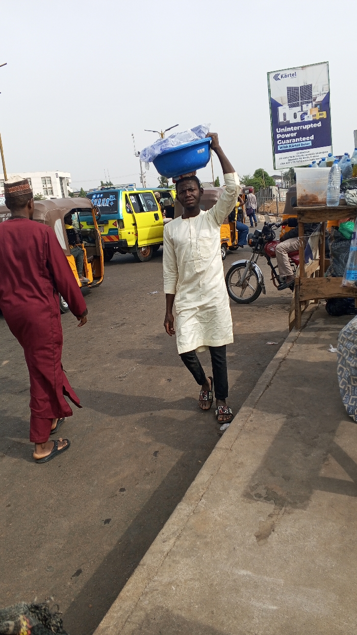 The image presents an active street scene in Maiburiji, Nigeria, under clear daylight conditions. In the central foreground, a male individual in a cream-colored long-sleeved tunic, dark trousers, and patterned sandals stands on the paved road, facing the camera. He balances a blue plastic basin, containing white plastic-wrapped items, on his head, with his left arm raised. To his immediate left, another male, wearing a maroon tunic and cap, walks away from the camera. The background features several auto-rickshaws (Keke Napeps), including two yellow units and one partially visible brown unit. A red motorcycle is parked further right, adjacent to a wooden market stall displaying bottled liquids and plastic containers. Above the stall, a large billboard for "Kärtel Solar" advertises "Uninterrupted Power Guaranteed With Kärtel Solar." Multi-story buildings and utility infrastructure are visible in the distant background beneath a bright, clear sky.