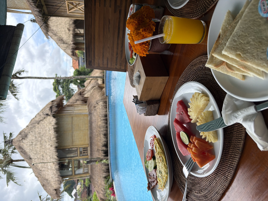 - "A table is set with a tropical breakfast beside a pool" by FM-PcEqo1, licensed under CC BY 4.0