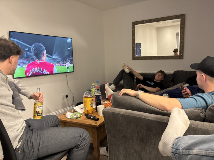 The image portrays an indoor scene, specifically a residential living room or common area. The room features light grey walls and is occupied by three young adult males in various states of relaxation, with a fourth male visible in a mirror reflection. On the left, a male with dark, curly hair, wearing a light grey long-sleeved top and dark blue jeans, is seated, holding an uncapped Corona beer bottle in his right hand. He is oriented towards a large, wall-mounted flat-screen television. The television displays a football match, showing a player from behind wearing a red jersey with "CARVALHO" and the number "17" clearly visible on the back. In the center-right, a male with short dark hair, wearing a dark t-shirt with a white graphic design, is reclined on a dark grey sectional sofa. His right foot, clad in a white sock, is elevated and rests on an unseen surface. He holds a white bottle or container in his raised right hand and is looking towards the television. In the right foreground, a third male, wearing a light blue t-shirt and a dark baseball cap, is seated on the same grey sofa. His feet, also clad in white socks, are extended. He holds a smartphone in his right hand and wears a silver-colored watch on his left wrist. A metallic drink can is visible beside him on the sofa. Above the sofa on the right wall, a large, ornate gold-framed mirror is mounted. It reflects a portion of the room, including a fourth male with dark hair, who appears to be standing or seated further back in the room, obscured from direct view. A light wooden rectangular coffee table is positioned in the center of the scene. It holds multiple plastic drink bottles, including a large yellow-labeled bottle and a dark cola bottle, a white ceramic mug, a smaller white cup, a black remote control, and a white packet of snacks. A white electrical outlet with a black plug is visible on the wall below the television, and a white radiator is located on the wall beneath the mirror. A blue blanket or throw is draped over the sofa. Regarding the location, the image itself does not contain any identifiable landmarks, street signs, or unique architectural elements specific to Newcastle upon Tyne, United Kingdom. Therefore, the precise location within that city cannot be determined solely from the visual evidence provided.