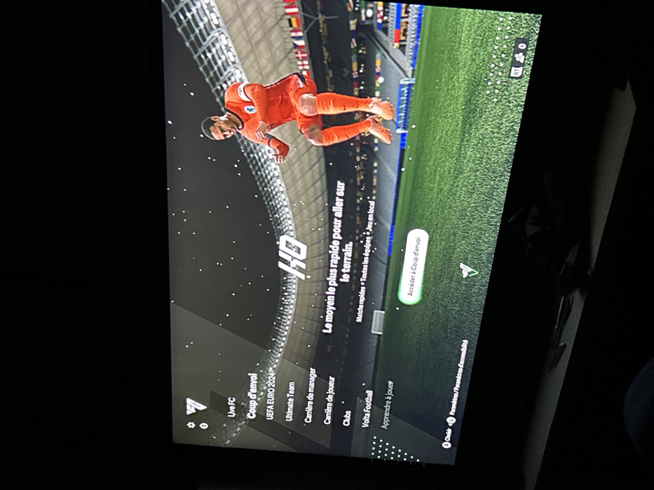 TV screen displaying the main menu of a soccer video game. On the left, game modes such as "Live FC", "UEFA EURO 2024", "Ultimate Team", and "Volta Football" are listed. At the top, the phrase "Le moyen le plus rapide pour aller sur le terrain" (The quickest way to get on the field) appears along with options like "Matchs rapides" (Quick matches). A button to "Accéder à Coup d'envoi" (Access Kick-off) is also visible. In the background is an image of a soccer player in an orange uniform, seemingly levitating over a soccer field.