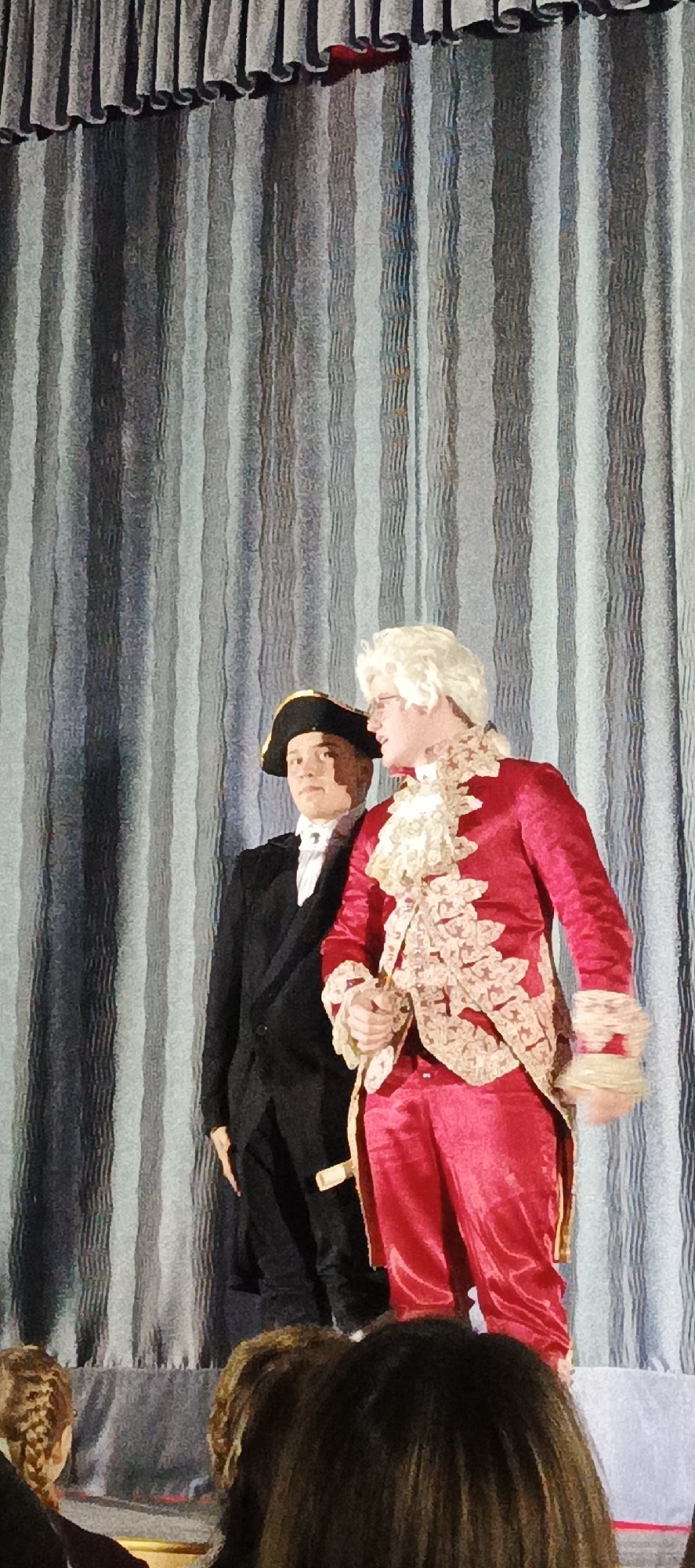 Two people stand on a stage with a striped backdrop. One person is wearing a black suit and tricorn hat. The other person is wearing a red suit with lace trim and a white wig. They are both holding small scrolls. There are people in the audience in the foreground. The location is not specified.
