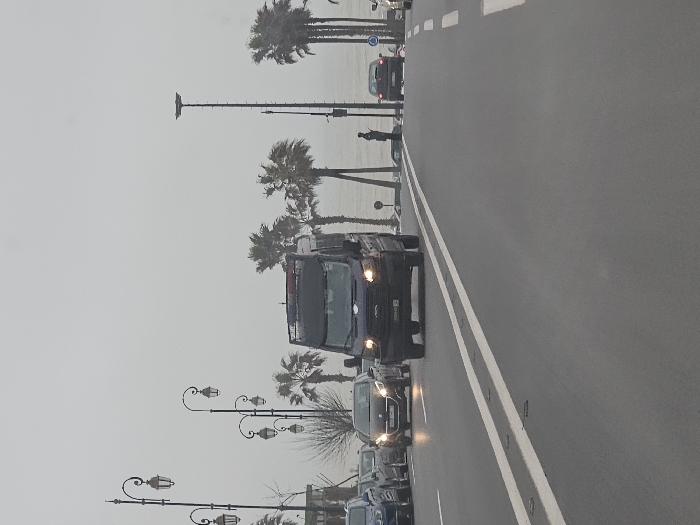 A street scene shows cars traveling on a multi-lane road alongside a coastline. Palm trees line the shore, adding to the seaside atmosphere. Streetlights with decorative lanterns stand on the roadside. The weather appears overcast, casting a hazy light on the scene. A pedestrian is visible near the water.