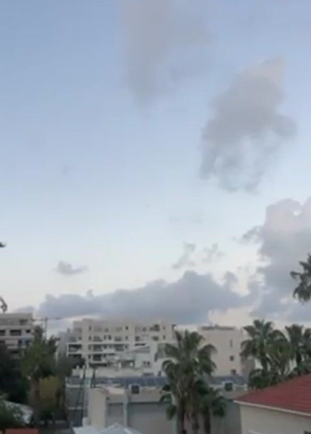 cityscape under a sky filled with light clouds. Modern white apartment buildings with solar panels are visible, along with palm trees and a few red-roofed houses. A small bird is flying in the distance.