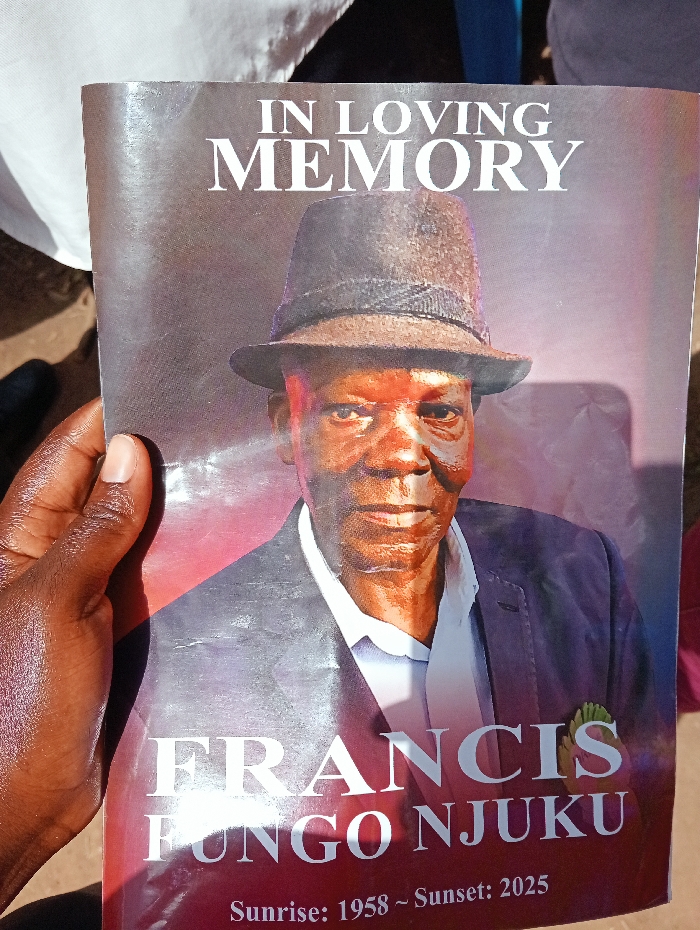 A dark-skinned hand holds a memorial program booklet at a high angle in an outdoor setting within Lumakanda ward, Kenya. The booklet's cover displays a color portrait of an older, dark-skinned male wearing a brown fedora hat, a white collared shirt, and a dark suit jacket. Above the portrait, white uppercase text reads "IN LOVING MEMORY". Below the portrait, the name "FRANCIS PUNGO NJUKU" is printed in white uppercase letters, followed by "Sunrise: 1958 ~ Sunset: 2025". The booklet's background transitions from a dark tone at the top to a reddish-brown gradient, exhibiting light reflections indicative of a glossy surface. A segment of light-colored fabric is partially visible in the upper left background. The hand holding the booklet appears to be under direct sunlight, showing a sheen on the skin.