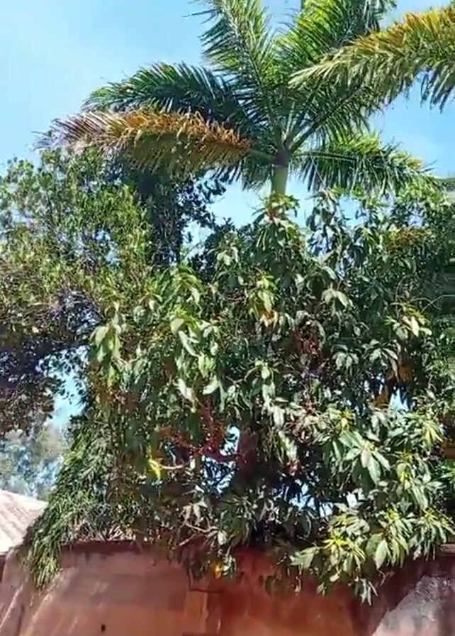 view of palm trees and other greenery behind a wall topped with barbed wire. The sky is blue and sunny. A roof is visible behind the trees and wall. The camera pans slightly.