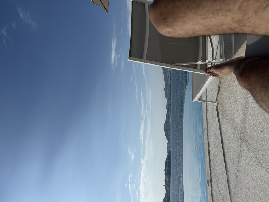 A sunny outdoor scene features a lounge chair positioned by an infinity pool. The pool merges with the ocean or a large body of water, and a distant coastline is visible. The person sitting in the chair is cropped, with legs and feet in view. The sky is blue with scattered clouds. Part of a sunshade is visible above the chair. The area surrounding the pool is a light gray textured surface.
