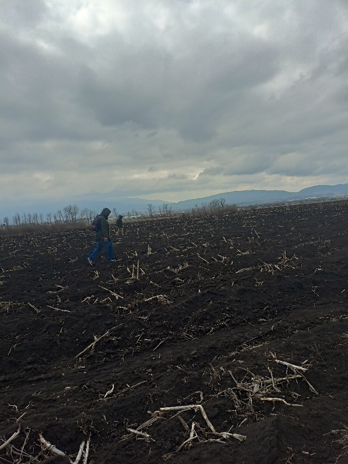 The image displays two individuals walking across a dark brown, tilled agricultural field located in Voluyak, Bulgaria