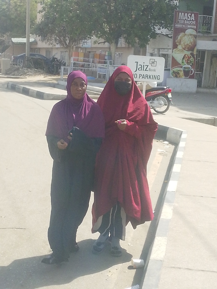 The image captures two adult females standing on a paved sidewalk in Gyadi Gyadi Arewa, Nigeria, under bright daylight