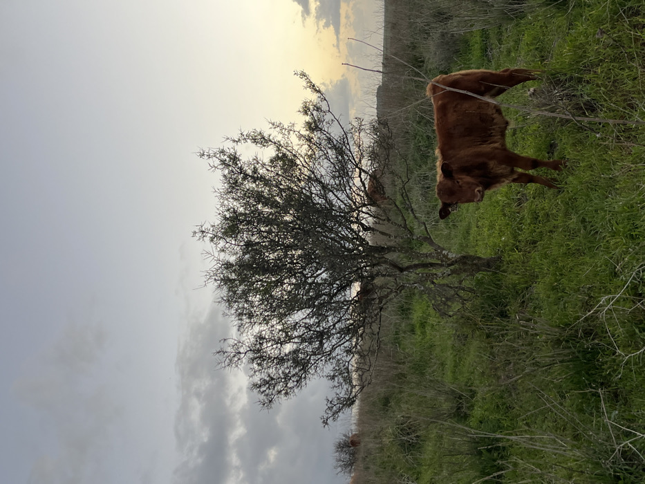 A brown cow stands in a field of green grass, facing towards the left. A bare tree stands in the foreground, its branches reaching towards a gray, cloudy sky with a hint of golden light at the top. The horizon line is slightly angled, giving the scene a tilted perspective. Another cow is seen on the backgorund. The light is soft, suggesting either early morning or late evening.