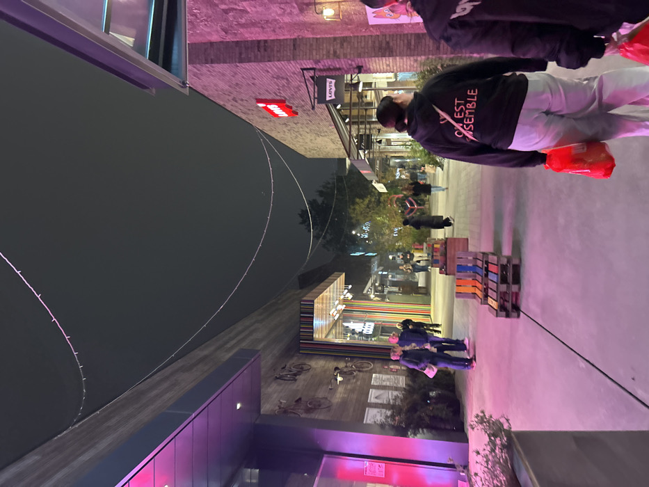 The image depicts a nighttime scene in a pedestrian shopping area located in Reichstett, France. The perspective is from a low angle, looking down a wide paved walkway illuminated primarily by artificial light. In the immediate foreground, two individuals are walking away from the camera. The person on the left wears a dark hooded sweatshirt with "C'EST ENSEMBLE" printed in pink text on the back, light-colored pants, and carries a red plastic bag in their right hand. The person on the right is mostly out of frame, wearing a dark jacket and also appears to be carrying a red bag. The walkway and adjacent building facades are bathed in a prominent pink and purple light. To the left, a modern building features a dark panel facade with decorative bicycle frames mounted on a section, and a brightly lit entrance. Further down this building, a section displays vertical colorful stripes. To the right, a brick building facade is visible, featuring a prominent red "Levi's" sign with white text, and a smaller "Levi's" sign below it. Several wooden pallet benches, painted with colorful stripes (blue, orange, red, green), are arranged along the pedestrian path in the midground. Beyond these, a number of blurred figures are seen walking or standing, suggesting a moderate crowd. Overhead, multiple strands of white string lights are suspended across the open-air path against a dark, featureless night sky. Planters with small shrubs are visible in the foreground and midground, contributing to the urban environment.