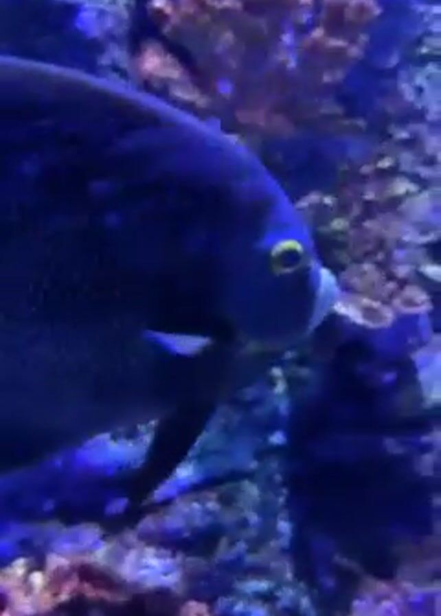 A blue fish swims in an aquarium