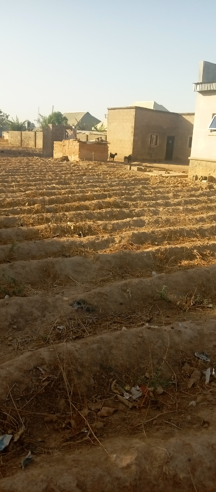 The scene depicts an outdoor environment in Rido, Nigeria, under a pale, clear sky. The foreground features a dry, tilled field composed of numerous parallel earth ridges and furrows, with sparse dry vegetation and scattered refuse material, including plastics and debris. In the midground, two goats, one dark brown and one slightly lighter, stand on unpaved ground near a single-story building constructed from tan-colored concrete blocks. This building exhibits a dark-colored door and a small, rectangular window opening. To the left, additional low-rise structures and partial walls, also appearing to be block or earth construction, are visible. The background reveals further buildings with light-colored, possibly metal, roofs and minimal green foliage. No human subjects are present in the frame. The area is illuminated by natural light, consistent with daylight conditions.