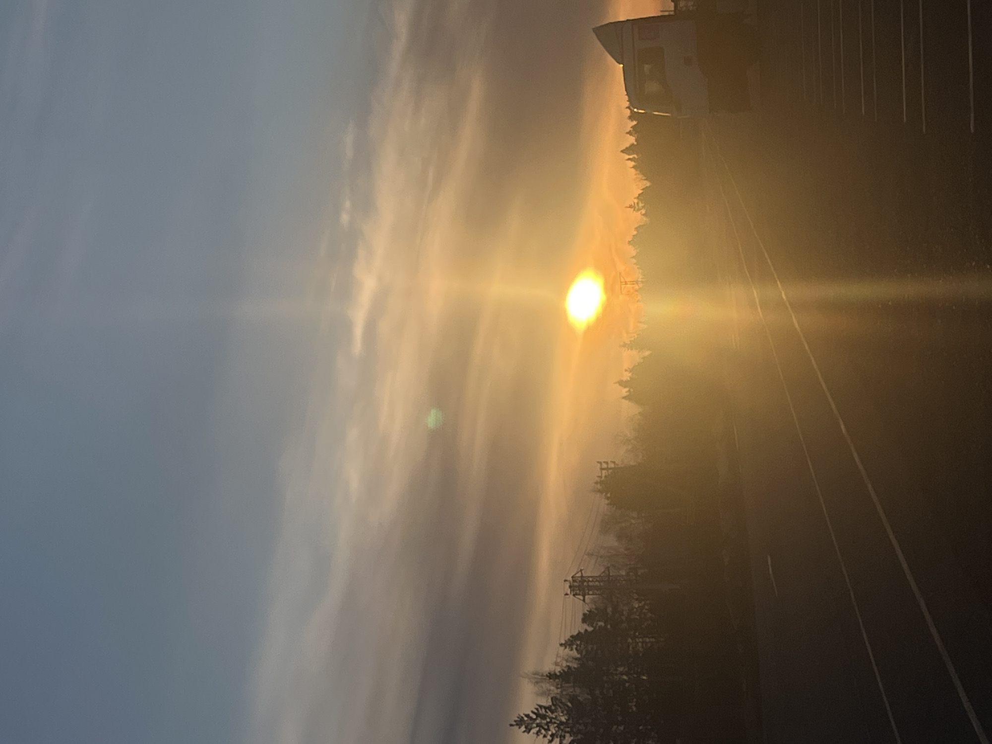 A landscape photo shows a sunrise or sunset, taken at an angle. The sun is a bright orb in the sky, obscured by clouds and creating a bright glare. Below, trees and power lines are silhouetted against the light. To the right, there is a road with lane markings. A white vehicle is parked to the right of the trees, obscured by the intense sunlight. The sky transitions from blue on the left to orange near the sun. This scene is likely set in the city of Ромашка Нп, Russia.