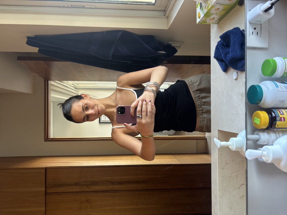 The image displays a female subject taking a mirror selfie in a bathroom. The exact location within Mexico City, Mexico, is not discernible. The subject, an adult female with dark hair secured in a bun or ponytail, is dressed in a black tank top with white shoulder straps and light brown elastic-waist pants. She holds a purple-cased smartphone in both hands, positioned to capture her reflection. Her jewelry includes a silver chain necklace, small hoop earrings, a silver ring on her left ring finger, a gold-colored bracelet on her left wrist, and multiple silver bangles on her right wrist. The bathroom features a light-toned countertop, reflecting two white pump dispensers, several vitamin/supplement bottles (one yellow-capped, one teal-capped, one green-capped), a blue folded cloth, a white circular charging pad, and a white electrical outlet with a USB charger. A floral-patterned tissue box is situated on the right side of the counter. Reflected in the background are a wooden cabinet on the left, an open doorway, a dark towel hanging on a wall hook, and a window providing natural light on the right.