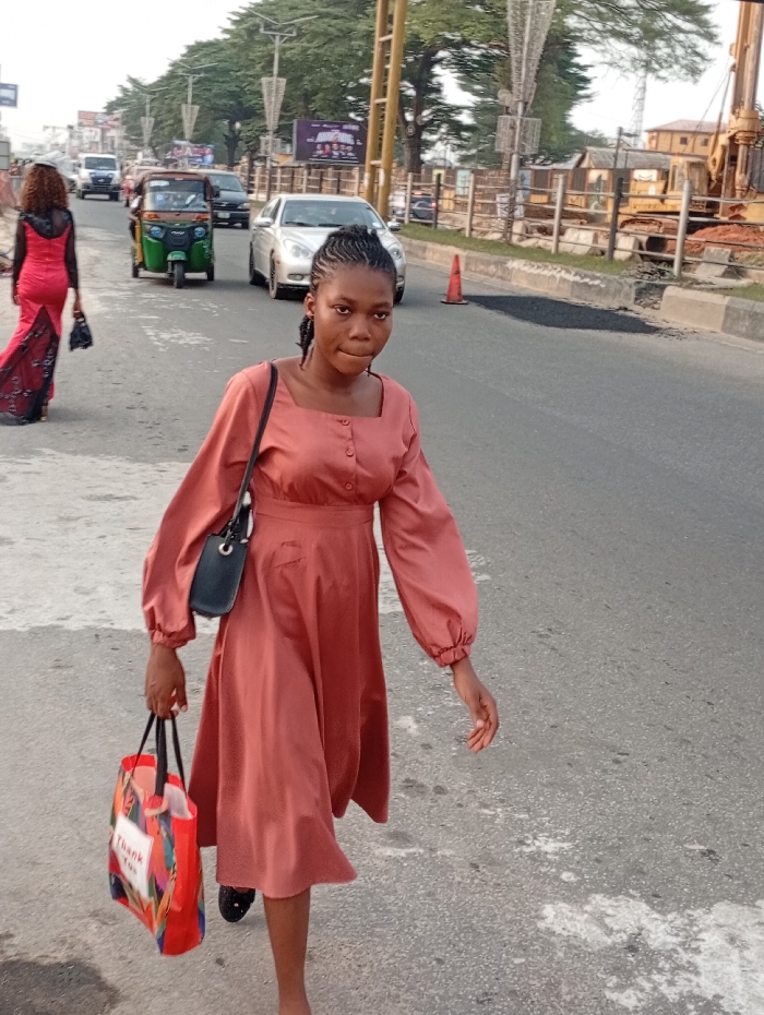 A young woman in a coral-colored dress walks on an asphalt road, carrying a colorful shopping bag and a small black purse. Behind her, a woman in a long red dress walks on the same side of the road, closer to the vehicles. A green "keke" (tricycle taxi) and a few cars travel on the road. Roadside construction with a large yellow machine is visible in the background, along with some trees and buildings.