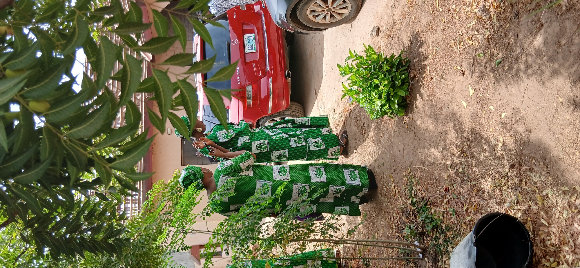 The scene depicts an outdoor environment in Unguwar Sarki, Nigeria, under bright daylight. The ground consists of bare earth mixed with dried leaves and scattered debris. In the midground, two women are prominent, facing partially away from the camera. Both are dressed in matching green and white patterned long dresses and headwraps. The woman on the right holds a dark-colored smartphone to her right ear, appearing to be engaged in a call or listening to audio. She wears brown open-toed sandals. The woman on the left stands slightly behind and to the left of the first woman, her back mostly to the camera, wearing dark enclosed footwear. A third person, similarly dressed in green and white, is partially visible on the far left. Behind the two main women, a red Mercedes-Benz GLK 350 SUV is parked facing away from the camera. Its rear license plate, "ABC-45FV", indicates registration in "FCT ABUJA". A portion of a dark-colored vehicle is visible on the far right, including its front wheel. A person in a white and blue patterned garment is partially visible behind the red SUV. The foreground features a dark, possibly broken, plastic bucket lying on its side to the far left. A small, vibrant green bush grows centrally on the ground. Overhead, dense green foliage, consistent with tree leaves (possibly neem, with some small yellowish fruits visible), partially obscures the sky and casts dappled shadows on the ground. In the background, light-colored building walls are visible, topped by a roof structure with horizontal wooden slats.