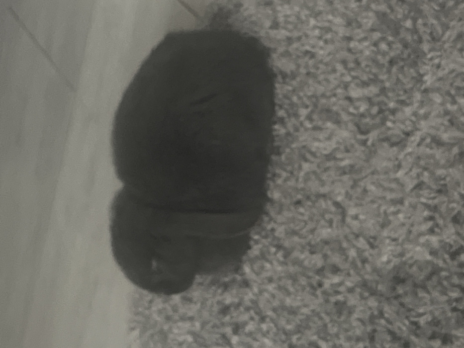 A dark-furred cat is curled into a tight ball. Its tail wraps around its body. The cat rests on a gray, textured carpet. To the left is a smooth surface with parallel lines, perhaps a wood floor. The lighting is dim, making it difficult to discern the cat's features clearly.