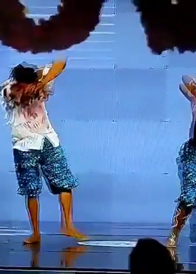 Two barefooted dancers, a man and a woman, wearing matching patterned blue and black shorts and light-colored shirts are performing a synchronized dance routine on a reflective black stage