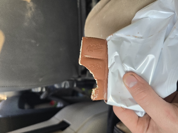 - "The image displays a close-up view of a partially consumed Milka chocolate bar held in a person's left hand" by FM-IYQQn1, licensed under CC BY 4.0