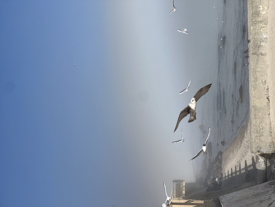 The image depicts a foggy coastal scene in Odesa, Ukraine, along the Black Sea shoreline. A dense fog bank extends from the mid-ground to the horizon, obscuring visibility, while the upper sky above the fog is clear and light blue. In the immediate foreground, a weathered concrete seawall runs horizontally, then turns sharply to extend along the left edge of the frame. This wall exhibits distinct shadow lines and surface textures. On the far left, partially enveloped by fog, is a multi-tiered concrete structure with railings, appearing to be a viewing platform or part of a coastal walkway that descends towards the water. A narrow, rocky and pebbly beach is visible between the base of the seawall and the water's edge. The dark, calm waters of the Black Sea stretch from the beach into the fog-shrouded distance. Several small, dark objects are scattered on the water's surface near the shore. Numerous seagulls are present. A large, grey and white seagull with prominent black wingtips and a white head is captured in mid-flight in the central foreground, wings fully extended. At least seven other seagulls are in various flight stages across the frame, some appearing sharper closer to the viewer, others more indistinct due to the fog and distance. Small, dark birds are visible perched on the beach and floating on the water's surface. No human figures are discernible within the scene.