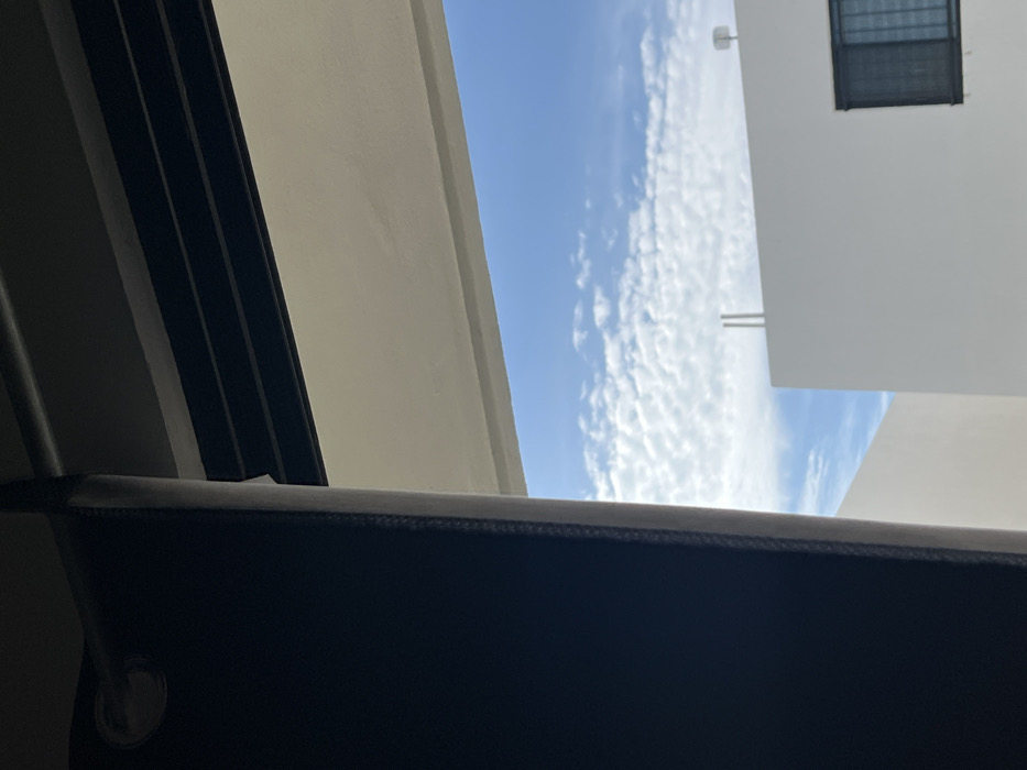 The image depicts an exterior view from an indoor vantage point in Komchén, Mexico. The foreground on the left is dominated by a dark curtain, likely black or navy, exhibiting a circular metallic grommet and a visible vertical seam or stitching. This curtain hangs from a silver-toned horizontal rod, partially obscured at the top of the frame. Above the sky and below the curtain rod, a light-colored (off-white or light grey) architectural overhang or ceiling structure is visible, spanning the upper mid-section, with dark horizontal lines directly beneath it. The central and right portions of the background reveal a clear blue sky interspersed with numerous small, scattered white clouds, indicating daylight conditions. Below the horizon line, a modern, white, flat-roofed building occupies the right side of the frame. On the roof of this building, two slender, grey vertical pipes are visible, alongside a small, light-colored disc-shaped object, possibly an antenna component. A dark-framed window, fitted with horizontal grates or blinds, is present on the visible side of this building. To the immediate left of this building, another white wall or building section is partially visible. No individuals, explicit actions, or direct interactions are discernable within the scene.