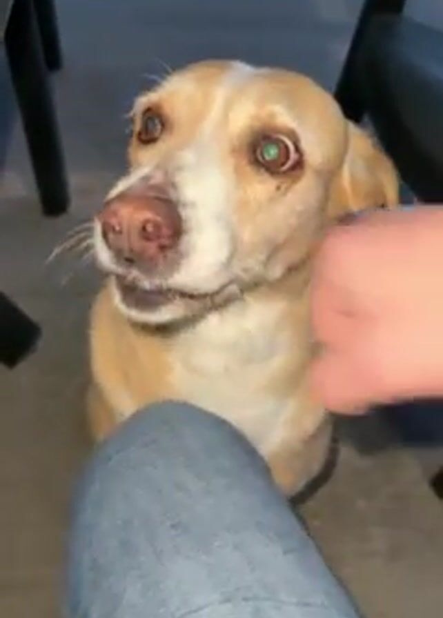 A tan-colored dog sits in front of a person wearing jeans. The dog sits upright, looking directly at the camera, then briefly catching a pink, toy pig tossed towards it. A person's hand reappears, offering the pig again. The dog opens its mouth wide, attempting to grab it. The dog has a light, white chest, a pink nose, and its eyes reflect with a green glow. Two dark chairs are visible in the background. A voice speaks a foreign language throughout the video.