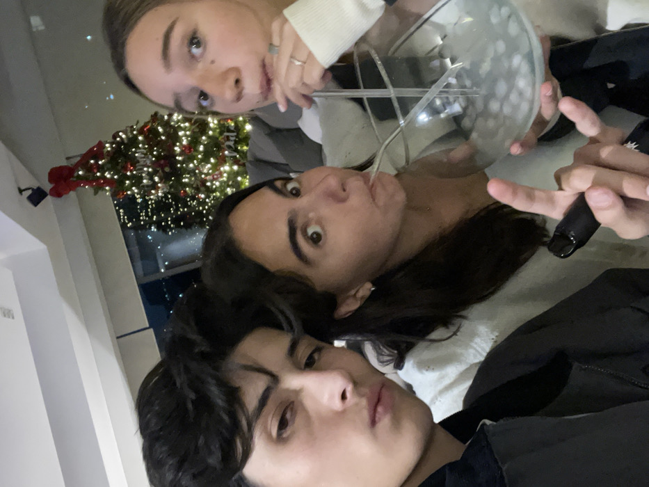 Three young individuals are in the picture. Two of them are drinking from a large, clear bowl filled with ice through metal straws. There is a Christmas tree with lights in the background. One person holds a vaping device. The angle is an upward selfie, capturing their faces and a portion of their torsos. They appear to be indoors, possibly at a party or festive gathering.