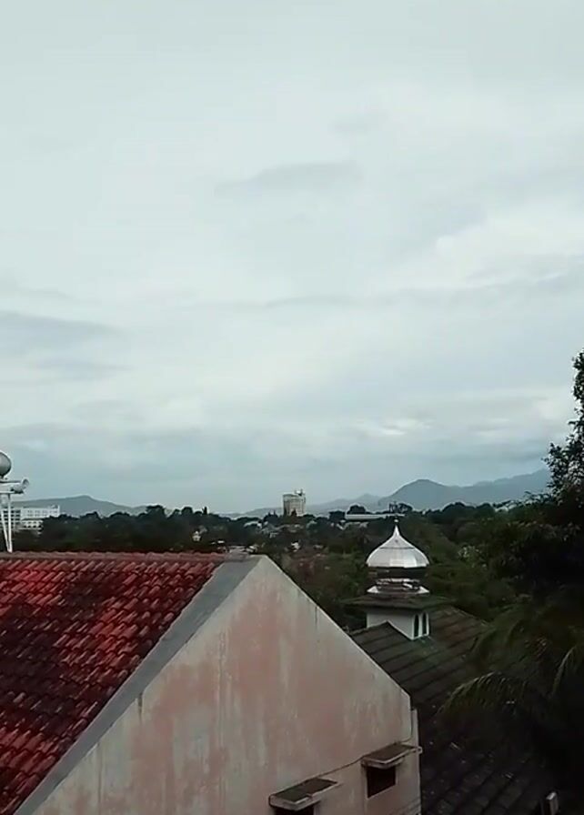 view of an urban area with several buildings and trees. The roofs of some buildings are visible in the foreground, including one with red tiles. In the background, there are mountains and a cloudy sky. A mosque-like structure with a silver dome is also visible. An Islamic call to prayer is heard.