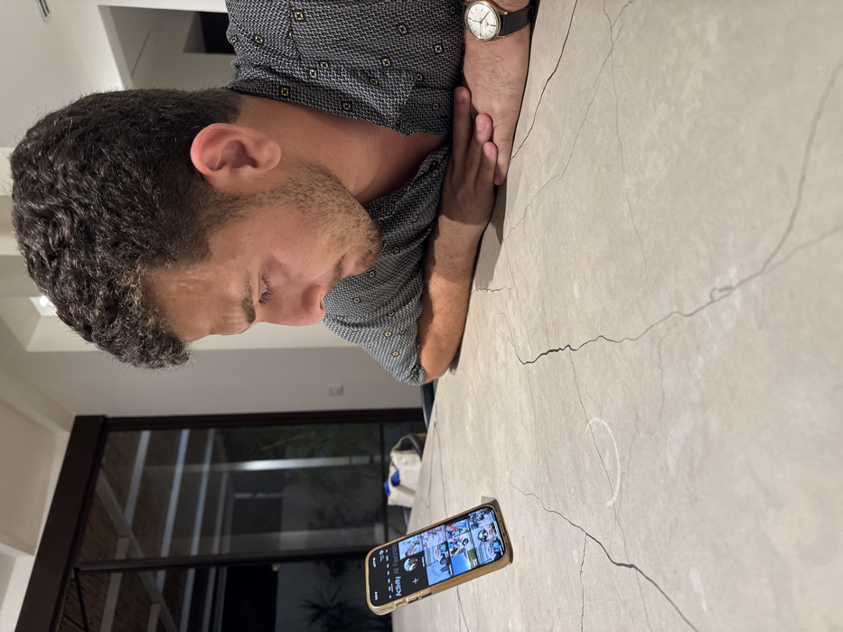 - "An adult male, viewed in profile from the upper torso, is intently observing a smartphone propped vertically on a light-colored, textured table" by FM-ohOUo2, licensed under CC BY 4.0