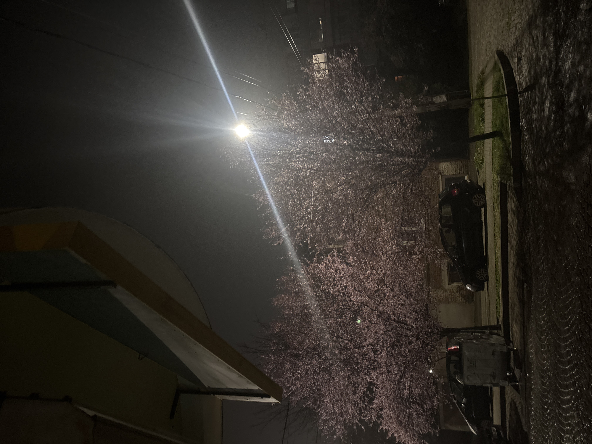 The image depicts a nighttime urban scene in Yambol, Bulgaria. The foreground features a wet, reflective cobblestone street surface, indicative of damp conditions. To the upper left, a partial architectural overhang or balcony structure is visible, painted with sections of yellow, blue, and light grey. In the midground, a grey, wheeled dumpster with a red reflective strip is positioned on the street, adjacent to a tree in full pink bloom. Behind the dumpster, a dark-colored vehicle, possibly a hatchback or small SUV, is parked. Further into the scene, multiple deciduous trees are prominently featured, all covered in numerous pink blossoms, suggesting a spring setting. A bright street light mounted on a utility pole stands centrally on the right, emitting significant lens flare and illuminating the wet pavement and nearby tree canopy. To the right, another dark vehicle is parked, partially obscured by a blooming tree. A narrow strip of green grass separates the street from what appears to be a sidewalk or building foundation. The background reveals darker building facades through the trees, with at least one window illuminated in a distant structure. Overhead, multiple utility wires are visible against the dark, possibly hazy night sky. No individuals are present in the scene, and no overt actions or interactions are depicted.